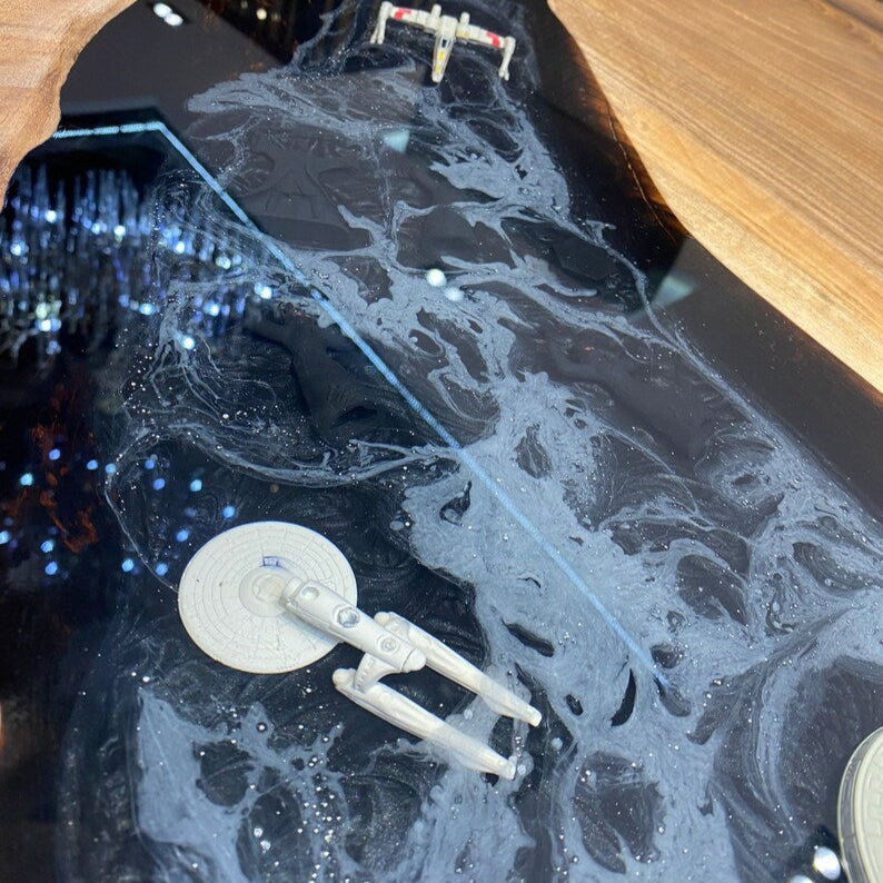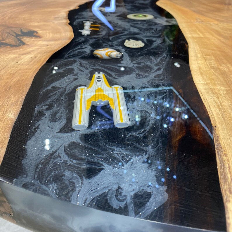 Unleash your inner Jedi with our Custom Star Wars Epoxy Table, featuring iconic galactic design set in deep black resin and rich wood. This round masterpiece blends pop culture with artisan woodworking, making it the ultimate centerpiece for fans who want their love for Star Wars etched into everyday life.
